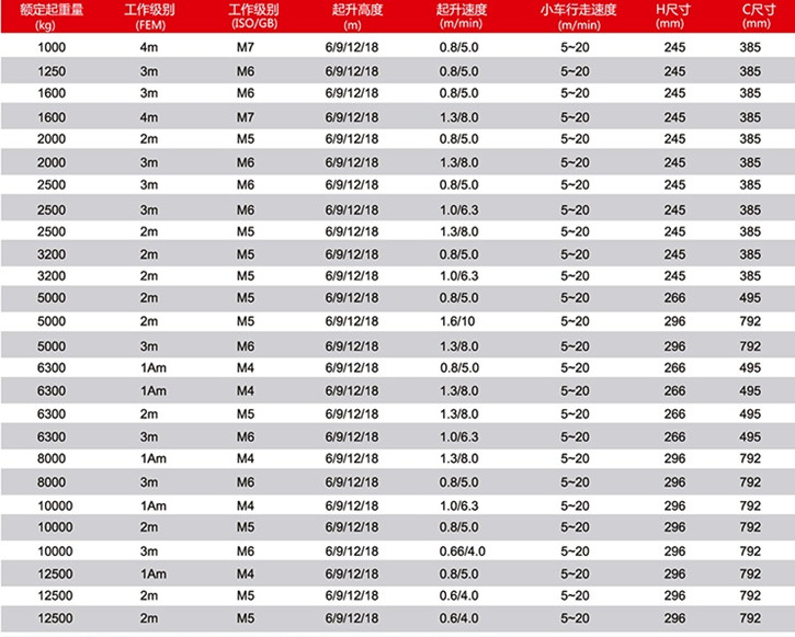 歐式鋼絲繩電動葫蘆(單梁)參數表:
